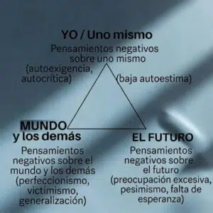 Cuando está presente la sintomatología depresiva, la dimensión cognitiva se ve afectada de manera triple debido a que aparecen pensamientos negativos en torno a:
